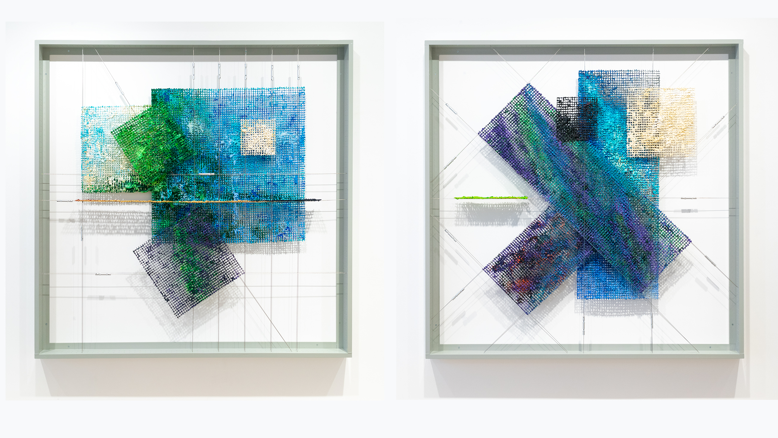 Landscape painting can transport the viewer to another world, to another time and place. Tillyer refuses to continue this familiar trope for reasons that strike me as both aesthetic and ethical. In their use of metal mesh, wire, and paint, the artist reminds us that we too are made of changeable material, and that we too are vulnerable.
